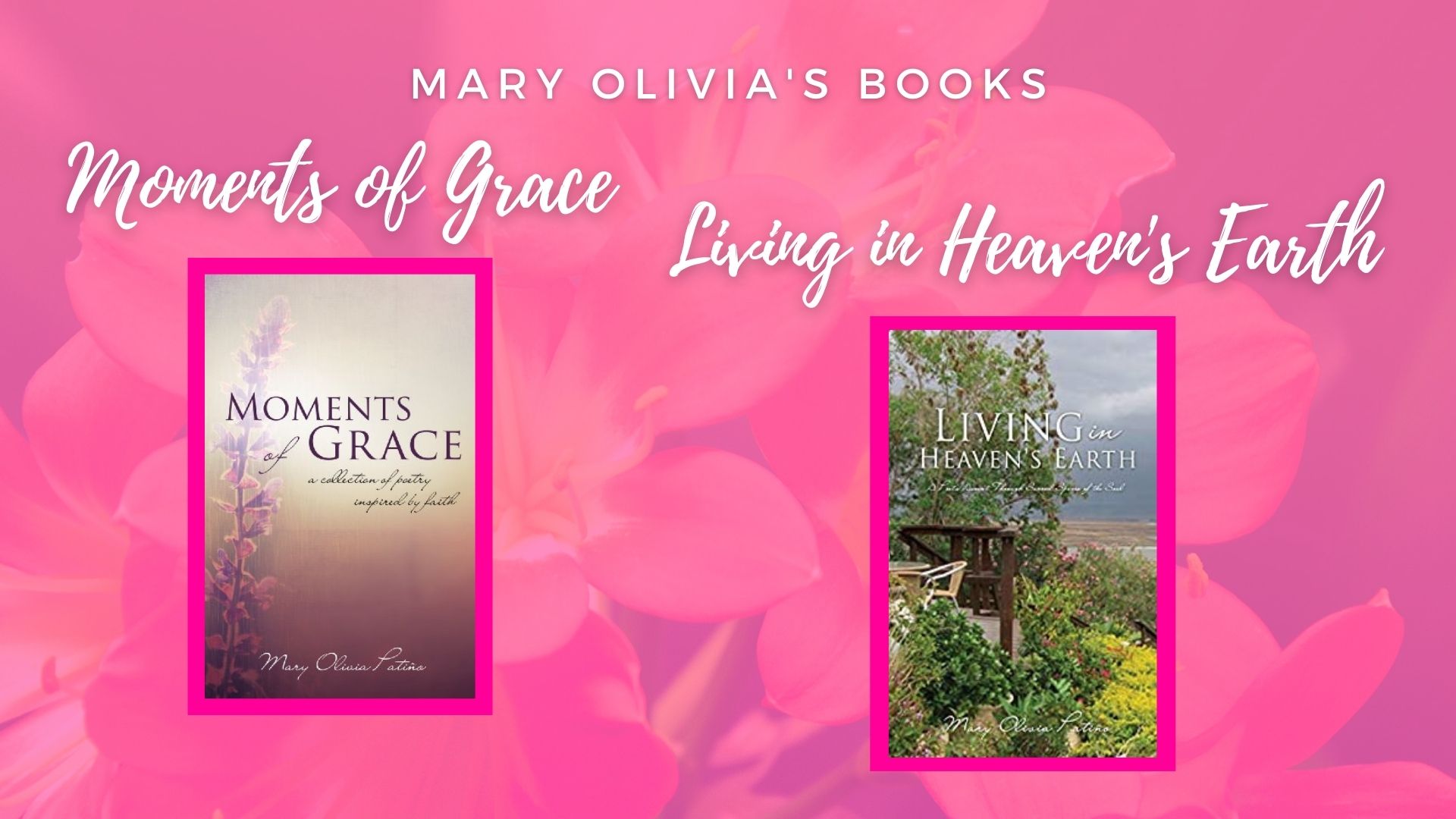 I have read both of Mary Olivia’s books and I can tell you that her poetry is amazing. One of my favorite poems from her book, Moments of Grace, is “Ancient Crannies” (page 57). And an especially touching poem to me from Living in Heaven’s Earth, is “Lord, You Visited Me” (page 174-177); yes, it is a little long, but wonderful all the same. I know, if you love poetry and read her book, you will fall in love with some of her poems, too.
